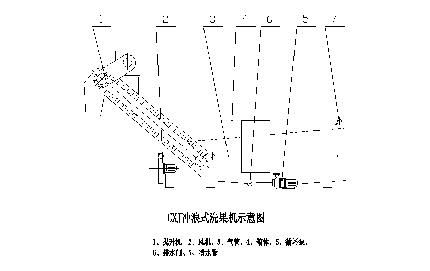 该机由机架、水箱、风机、提升机、气泡管、喷水管等几部分组成,工作时由于水中风力的存在,蔬果在水中任意方向翻滚转动,并在高压水力的推动下向前移动,在出口由一刮板提升机,将91香蕉视频在线看送至下道工序。整体为分体式结构,水箱与输送机、进出料斗、罩板方便拆卸,易于清洗和检修。