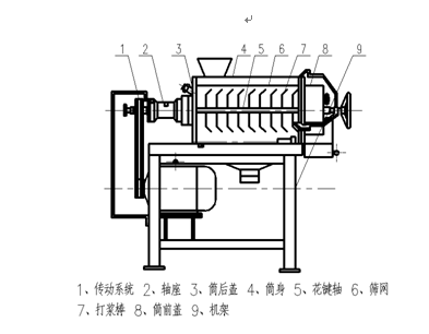 ★ 主要结构:传动系统、轴承座、套轴、筒后盖、挡浆盘、筒身、花键轴、筛网、刮板(或去核棒)、筒前盖、机架等